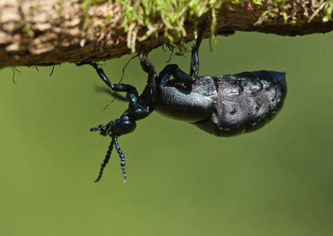 The black oil beetle is mainly found on coastal grasslands with lots of wildflowers, as well as lowland grasslands further inland and occasionally heathlands or woodland sites. Adults appear early in the year, in February or March. They feed on grasses and the leaves and petals of flowers, fattening up as they prepare to breed.Oil beetles have an unusual lifecycle. Females dig burrows and lay huge numbers of eggs inside them. When the eggs hatch, the larvae (called triungulins) leave the burrow and climb onto a nearby flower. They wait for a bee to arrive (usually a solitary bee) and grab onto it, hitching a ride back to the bee's nesting burrow. Once inside a bee's burrow, a triungulin will eat the bee's own eggs or larvae, as well as the pollen stored up for them. The young beetle will stay in the burrow, pupate and emerge as an adult the following spring.